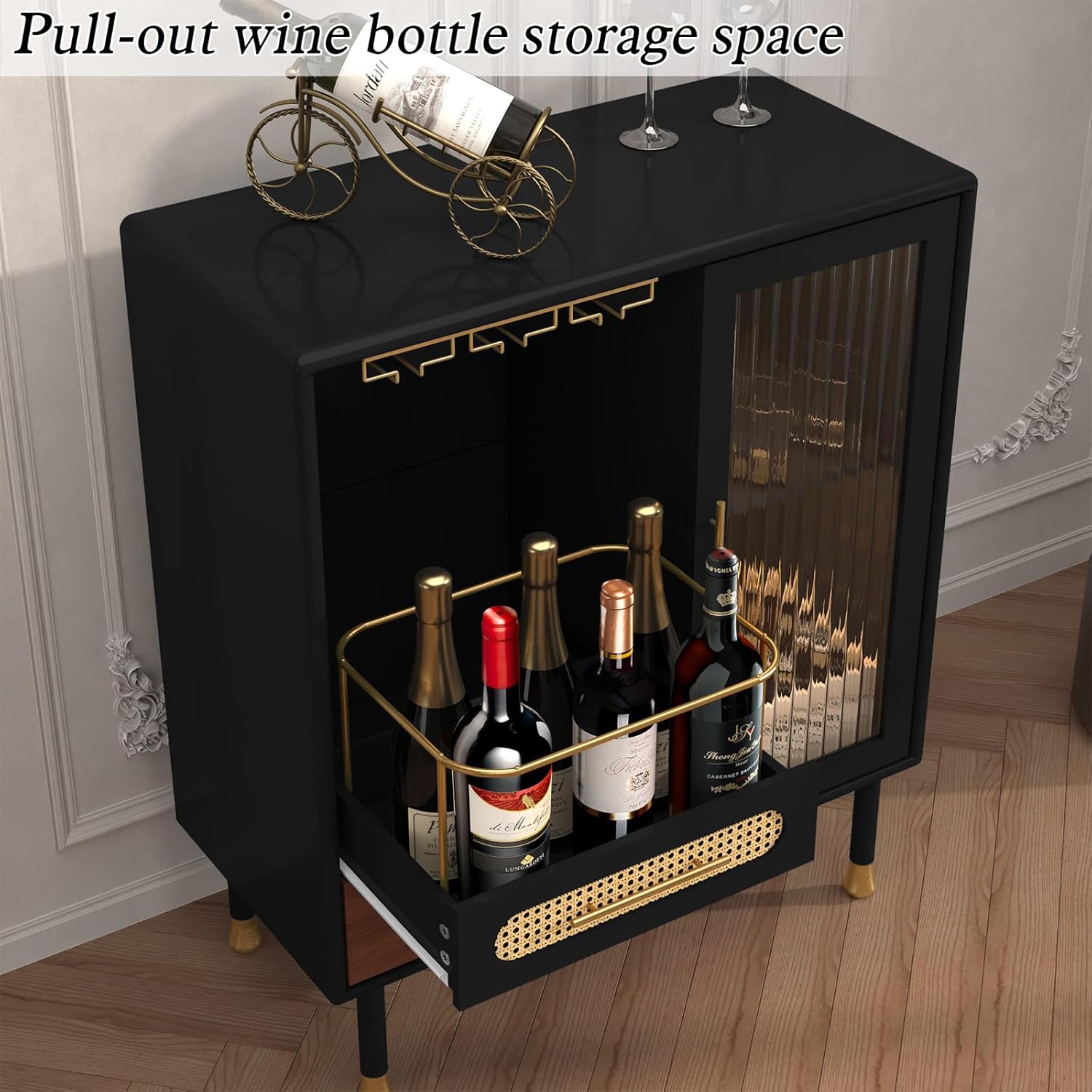 ARTPOWER Modern Coffee Bar Cabinet with Wine Glass Rack and Drawers, Black Liquor Cabinet with Pull-Out Wine Storage for Kitchen, Dining Room, Living Room