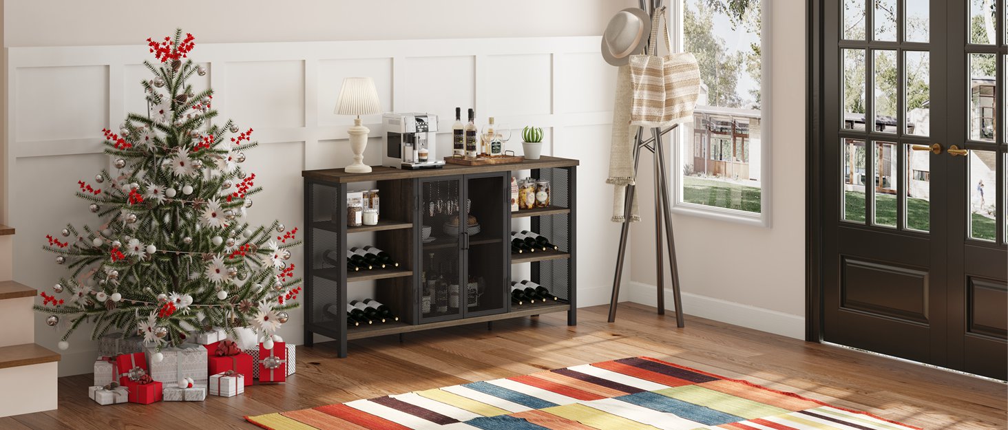 FATORRI Industrial Wine Bar Cabinet for Liquor and Glasses, Wood Coffee Bar with Wine Rack, Metal Sideboard and Buffet Cabinet (55 Inch, Walnut Brown)