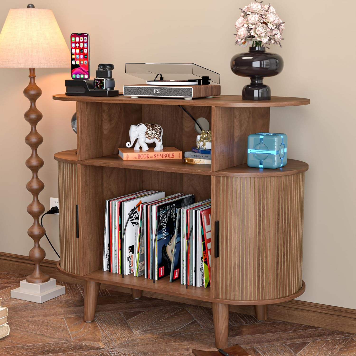 Large Round Record Player Stand with Charging Station & USB Ports,Record Storage Cabinet, Mid Century Modern Turntable Stand for Bedroom Living Room (Small Brown)