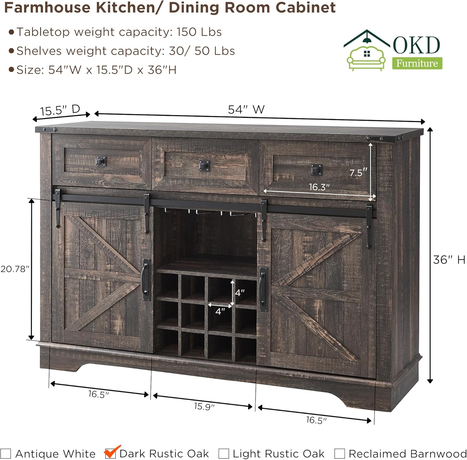 OKD Farmhouse Wine Bar Cabinet w/Sliding Barn Door, 54" Kitchen Coffee Bar Cabinet w/Wine & Glass Rack, Storage Shelves, 3 Drawers, Rustic Large Buffet Sideboard for Dining Room, Dark Rustic Oak