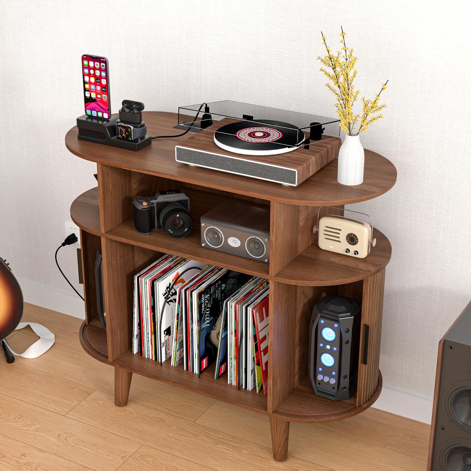 Round Record Player Stand, Mid-Century Record Player Table, Vinyl Record Player Shelf with Power Outlet Sideboard Buffet Cabinet, Storage Shelf for Living Room (Brown)