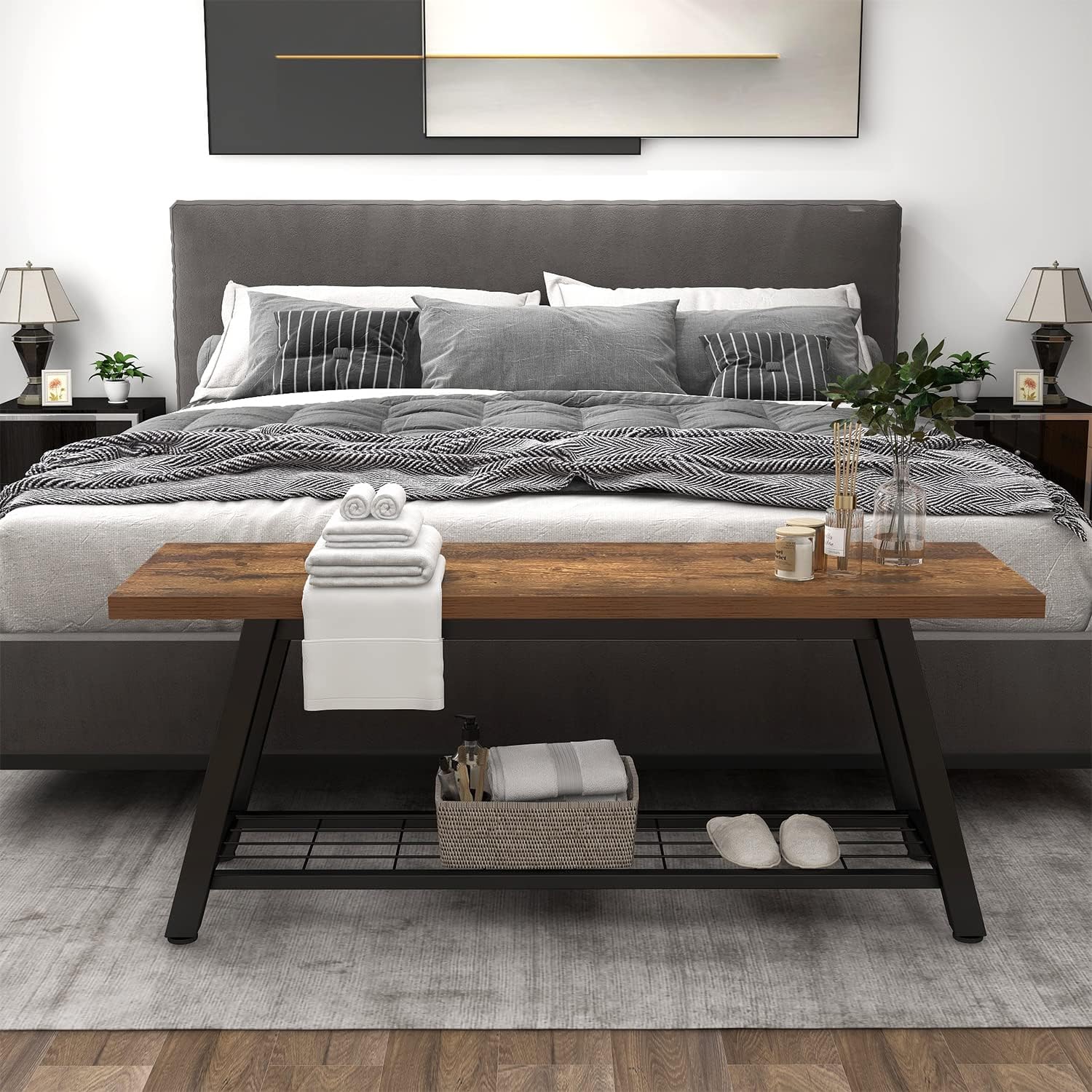 Storage Bench Industrial Rustic Wooden and Metal Entryway Shoe Boots Storage Rack Long Bench Seat for Hallway Bedroom Retro Brown Farmhouse Style
